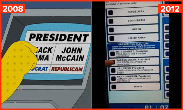 WAIT A MINUTE, that last bit sounds like I DO believe there’s something strange going on! But where’s the evidence to suggest these predictions have come to fruition? That the show has foreseen the future?? Below is a 2008 episode showing a faulty voting machine. Each time Homer votes for Obama, McCain is registered instead. On the right is what actually happened in 2012 when voters choosing Obama found that the machine was ticking Mitt Romney instead. Mitt Romney……..the very person The Simpsons were endorsing!!!