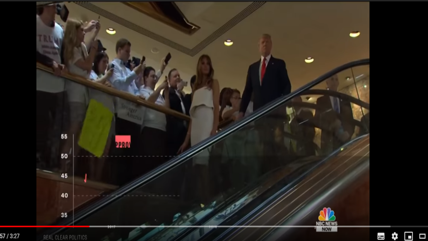 In a Simpsons special “Trumptastic Voyage” from July 2015 we see that famous escalator scene in Trump Tower. The real life version of this event happened a month earlier on the 16th of June 2015, including the speech behind the podium.